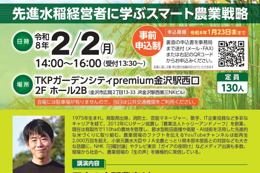 <背景・課題> これら課題の解決に向けて、石川県では「能登農業復興スマート農業技術研究コンソーシアム」を立ち上げ、GPSレベラー等による営農環境整備技術(ほ場の大区画化等)、衛星センシングとドローンによる高精度可変施肥技…