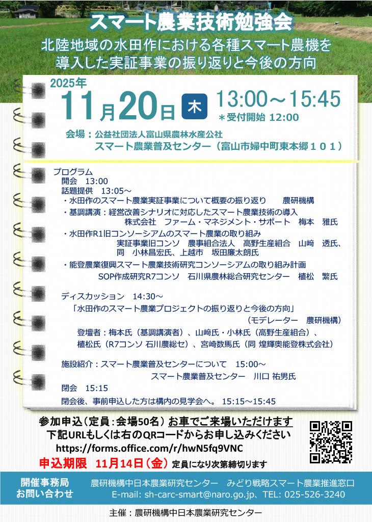 農研機構 中日本農業研究センターより、スマート農業勉強会が開催されます。今回のテーマは北陸地域の水田作におけるスマート農機導入の効果となっており、石川県農林総合研究センターからも「能登農業復興スマート農業技術研究コンソーシアム」の取り組み計画について発表されます。