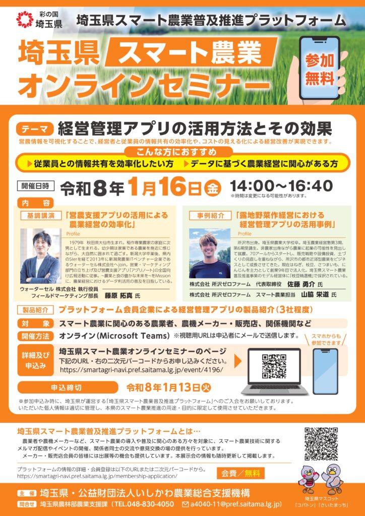 当プラットフォームと連携して活動している埼玉県スマート農業普及推進プラットフォームより「経営管理アプリの活用方法とその効果」をテーマにセミナーが開催されます。管理者と従業員の情報共有の効率化や、コストの見える化など、営農情報のデジタル化による経営改善効果について、実際の活用事例を交えて知ることができる内容となっておりますので、ご興味のある方はぜひご参加ください!