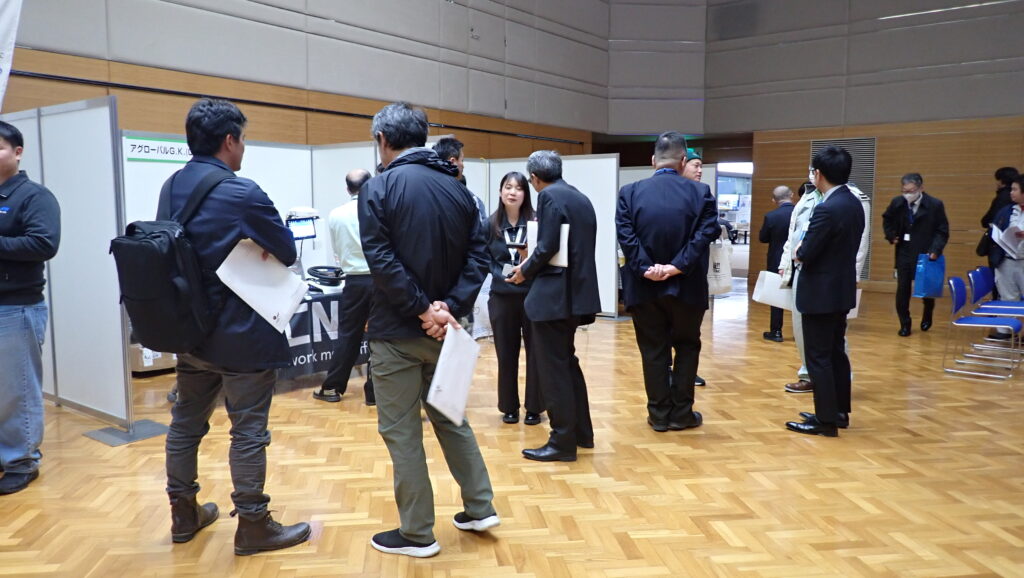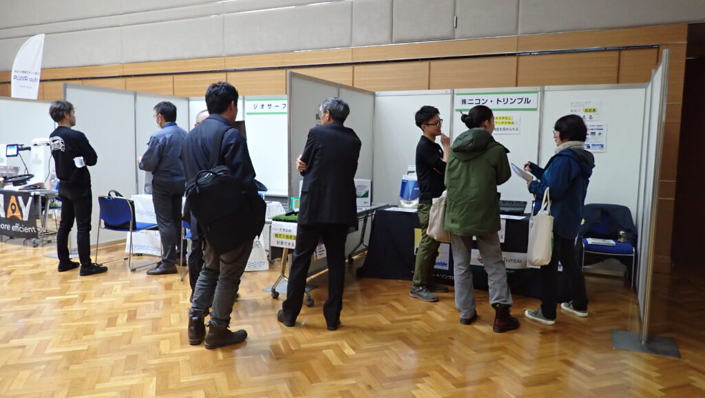 最後に、GNSSを利用した機器を取り扱うメーカー5社から、技術紹介のプレゼンテーションが行われ、自動操舵システムやRTK基準局などについて、最新の機能や特徴が紹介されました。会場内にはメーカーごとに技術展示ブースを設け、参加者が各メーカーの担当者と直接意見交換をし、今後の導入に向けた有益な情報を知るよい機会となっていました。