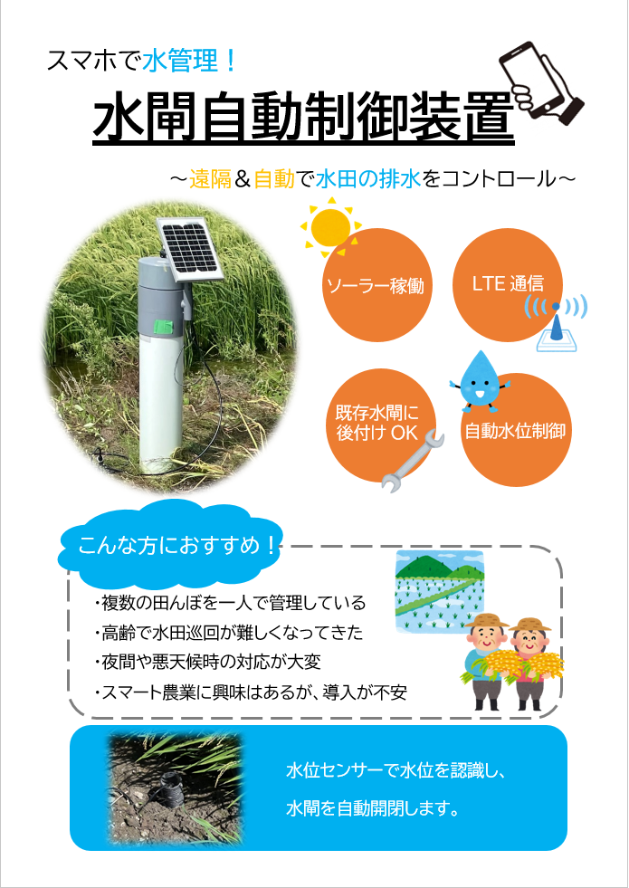 株式会社ナラ工業 株式会社ナラ工業 水閘自動制御装置 価格 対象品目 水稲畑作物露地野菜 他産地の導入実績 (登録会員からのアピールポイントなど) 水田の水閘を遠隔で操作したり、水位計で自動的に開閉できる装置です。 製品カタログ 424 KB 製品PR動画(URL)